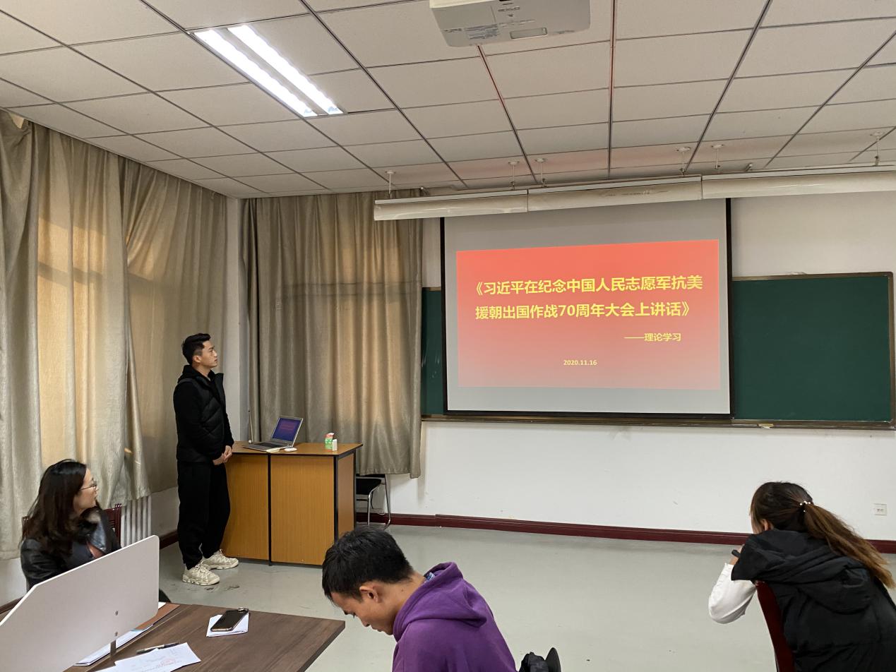 会议第一项由霍鹏飞带领全体党支部成员学习了“习近平在纪念中国人民志愿军抗美援朝出国作战70周年大会上讲话”并提出了自己对抗美援朝的理解,大家对于习近平在此次大会上的讲话内容展开了学习以及研读,表示将始终“铭记伟大胜利,推进伟大事业”的初心和使命。不断加强学习,向着全面建设社会主义现代化国家新征程,向着实现中华民族伟大复兴的中国梦,继续奋勇前进!