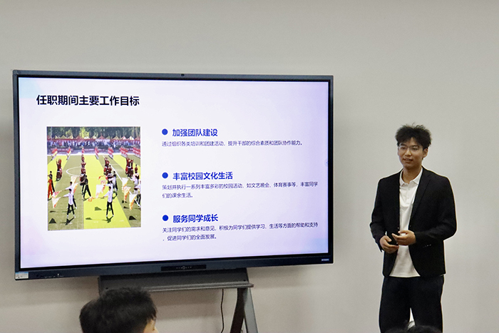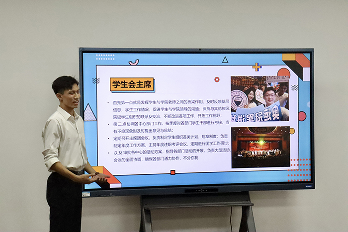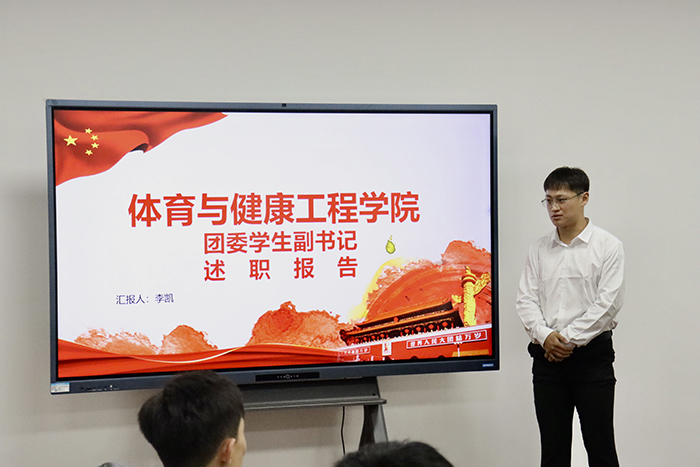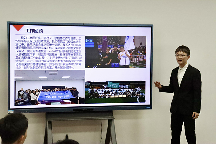 阳光体育发展中心主任张志刚分别从工作背景与职责概述、活动实施情况、成果展示与经验教训总结、结束环节等方面进行述职,并提到:团学组织是一个大熔炉,经过千锤百炼我们才有了今天的雏形,一次次活动历历在目,一次次成长印象深刻,向所有辛勤付出的同学和老师致以最真挚的感谢。