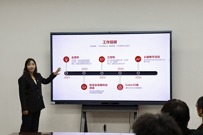 员工会主席团成员刘浩然分别从工作经历、参与活动、个人总结、未来规划等方面进行汇报。他说:团学组织这趟旅程我满载而行,我们充满激情,并肩作战,共同面对挑战,共享成功喜悦,相信自己的能力和团队的力量,勇敢地面对未来的挑战和机遇继续发扬团结协作、勇于创新的精神,不断攀登新的高峰。“责任和使命我们都要”