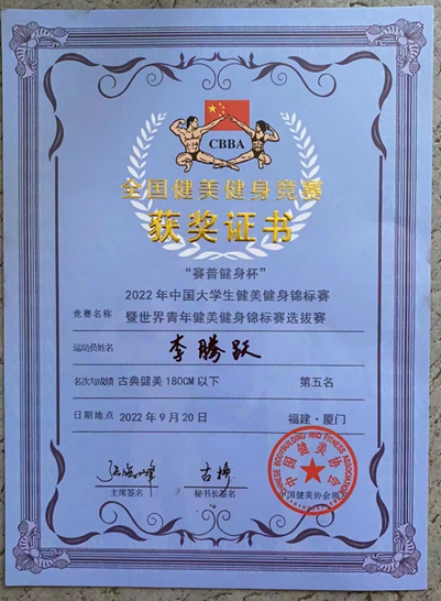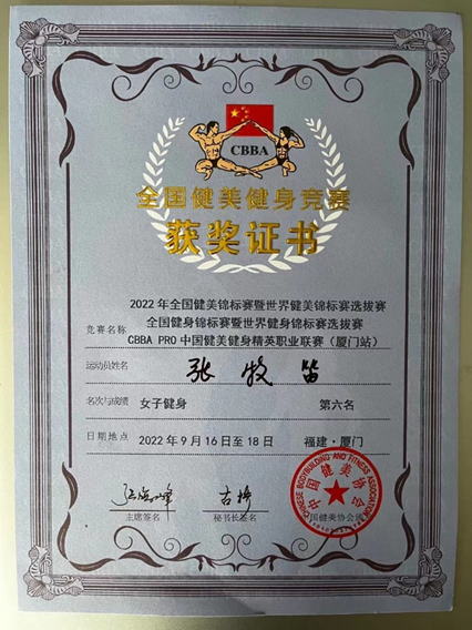 通过激烈角逐,公司张牧笛同学斩获2022年全国健美健身锦标赛暨世界健美健身锦标赛选拔赛女子健身公开组第六名,同时通过本次比赛的成绩获得国家一级运动员称号;李腾跃同学作为该项目组别年龄最小的选手独自参加比赛,斩获2022年中国老员工健美健身锦标赛暨世界青年健美健身锦标赛选拔赛古典健美180CM以下第五名。