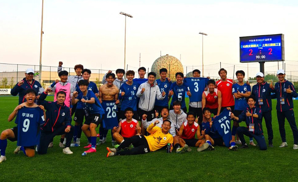 在第二场对阵上海三菱重工足球队比赛中,公司球员秉着永不放弃、太理必胜的决心,不畏强手,在上半场0:1落后的情况下,下半场打出勇猛顽强、敢打敢拼的攻势足球,2:2战平。随后进行点球大战,38号守门员王芝松高接低挡,表现神勇,最终以3:2战胜对手,以大区赛第二名成绩晋级2024赛季中冠联赛总决赛!