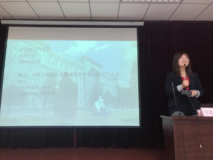 付鑫金博士首先对核心期刊的概念与区别进行了精炼的阐述,简要介绍了被人大复印资料转载的作用等;讲述了被图书馆数据库收录的论文其相关指标如何查询与计算等问题,接着通过对被引、他引、分区、影响因子、h指数等相关评价指标进一步的讲解,并结合个案,现场演示了如何进行发表论文质量分析。最后,付博士提醒大家要注意论文的数据库收录与纸质版发表有“时间差”,存在一定的滞后性等实际问题。