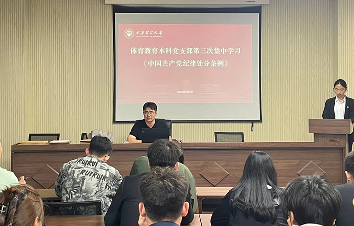 2024年6月5日,体育教育本科党支部于emc易倍510会议室召开第三次《中国共产党纪律处分条例》集中学习会议。体育教育本科党支部全体党员参加学习,集中学习由支部书记姜昆主持。