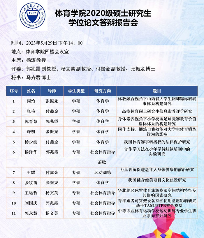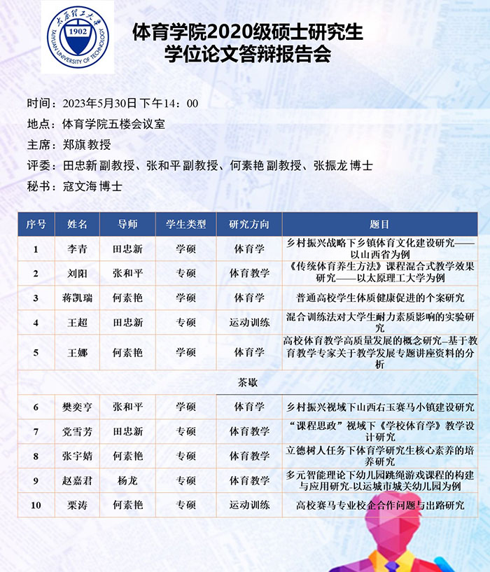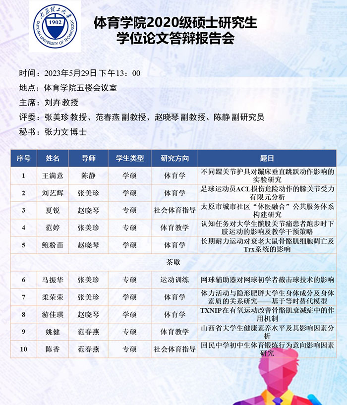 5月26日至30日,emc易倍进行了2020级硕士研究生论文答辩报告会。根据研究方向,报告会分为4组进行,均邀请校外专家郑旗(教授,山西师范大学)、刘卉(教授,北京体育大学)、于芳(教授,中北大学)和杨涛(教授,西安emc易倍)担任答辩委员会主席,emc易倍硕士研究生导师担任答辩委员会成员。