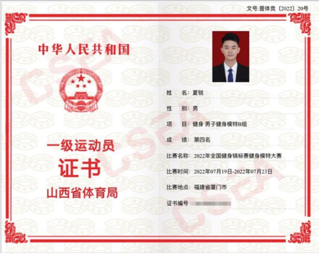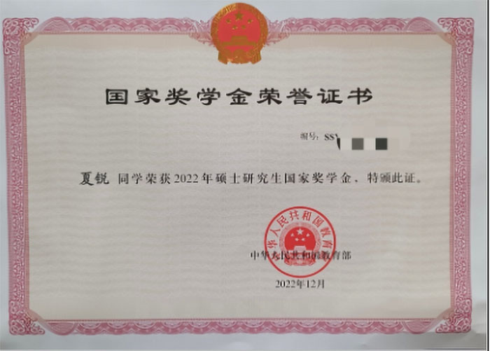 夏锐同学自入学初就有坚定的读博信念,在导师赵晓琴副教授的精心指导下,制定了硕士三年的科研学习计划,并在学习中不断调整优化。夏锐同学就读硕士期间,积极向上,勤奋钻研,成绩优异,取得了大学英语六级496分的好成绩,先后获得国家奖学金,研究生一等学业奖学金,两次研究生二等学业奖学金。并以第一作者身份发表北大核心期刊论文1篇,发表国际会议论文3篇,其中一篇为EI全文收录,并在大会做了全英文口头汇报。此外,在2022年全国健身健美锦标赛中,夏锐同学获得男子健身模特B组第四名,并荣获国家一级健身健美运动员称号。