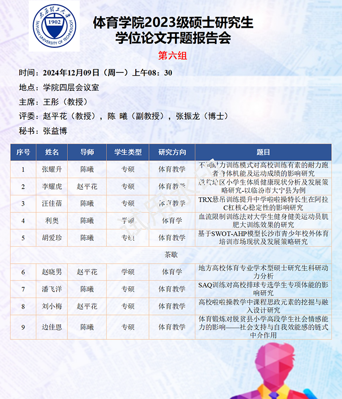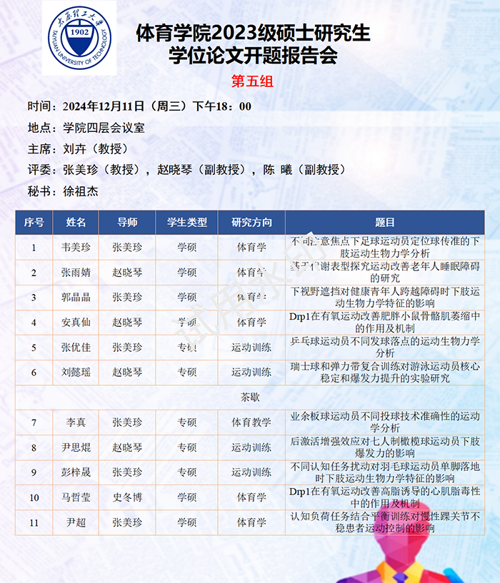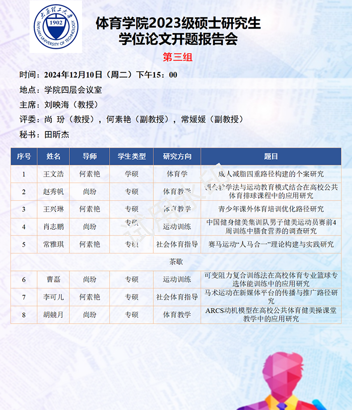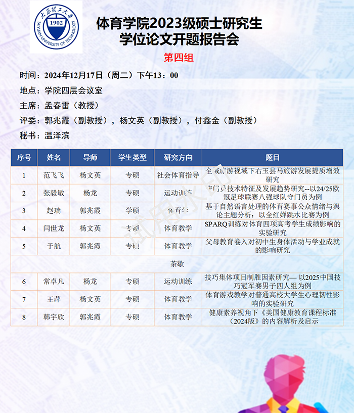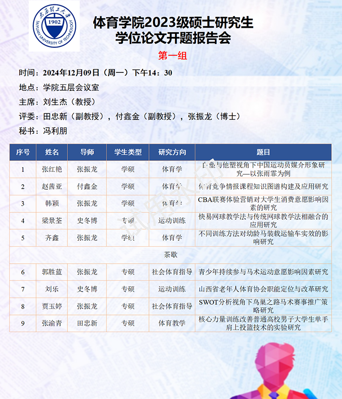 依据研究方向,报告会分为六组进行,由校外专家北京体育大学刘卉教授、山西大学emc易倍刘映海教授、山西大学emc易倍刘生杰教授、山西师范大学郑旗教授、山西师范大学王彤教授、山西师范大学孟春雷教授,担任答辩委员会主席,由emc易倍硕士生导师担答辩任委员会成员,共同完成了此次开题答辩报告会。