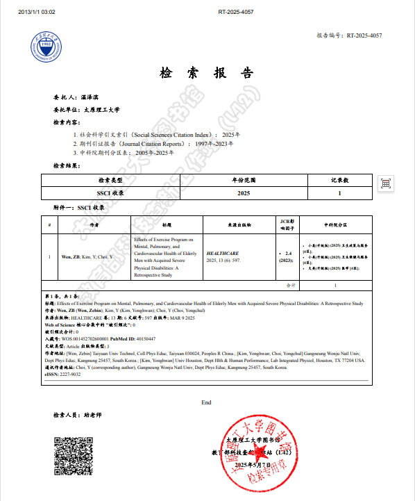 公司教师温泽滨讲师作为第一作者的研究论文《(Effects of Exercise Program on Mental, Pulmonary, and Cardiovascular Health of Elderly Men with Acquired Severe Physical Disabilities: A Retrospective Study)》在国际期刊《Healthcare》(2025年卷13期)正式发表。该期刊为社会科学引文索引(SSCI)来源期刊,2023年影响因子2.4,位列中科院期刊分区医学大类4区。