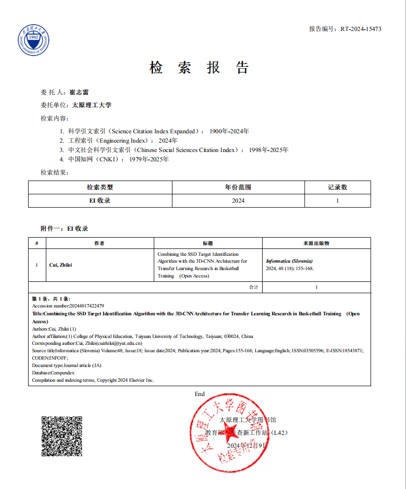 公司教师崔志雷副教授的研究成果《Combining the SSD Target Identification Algorithm with the 3D-CNNArchitecture for Transfer Learning Research in Basketball Training》在《Informatica》在线发表。《Informatica》主要专注于信息系统、计算机科学以及跨学科应用领域。尤其关注这些技术在体育科学中的创新应用,如运动数据分析、运动损伤预测、智能训练系统等。该期刊被工程索引EI(Engineering Index)收录。该论文是公司崔志雷副教授(第一作者、通讯作者)的研究成果,emc易倍为署名单位。