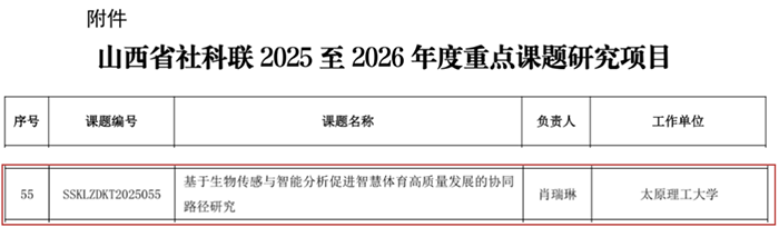 近日,山西省社会科学界联合会2025至2026年度重点课题立项通知,公司教师肖瑞琳申报的《基于生物传感与智能分析促进智慧体育高质量发展的协同路径研究》课题成功获批立项。该课题聚焦智慧体育发展前沿,深度融合生物传感技术与智能分析方法,着力探索促进体育产业高质量发展的创新路径,体现了教师在跨学科研究领域的学术敏锐性和创新潜力。