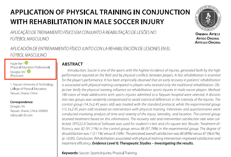 公司教师任慧杰博士的研究成果《Application Of Physical Training In Conjunction With Rehabilitation In Male Soccer Injury》在《Revista Brasileira De Medicina Do Esporte2022年第5期)发表。Revista Brasileira de Medicina do Esporte》是巴西运动医学和体育学会的官方机构,是运动科学和运动医学(SBME)领域科员工产的主要促进资源,是被SCI收录的体育科学类期刊87种之一,其JCR影响因子为0.589,中科院期刊分区为4区。论文是任慧杰讲师(第一作者)与emc易倍史冬博教授的合作成果,emc易倍为第一署名单位。