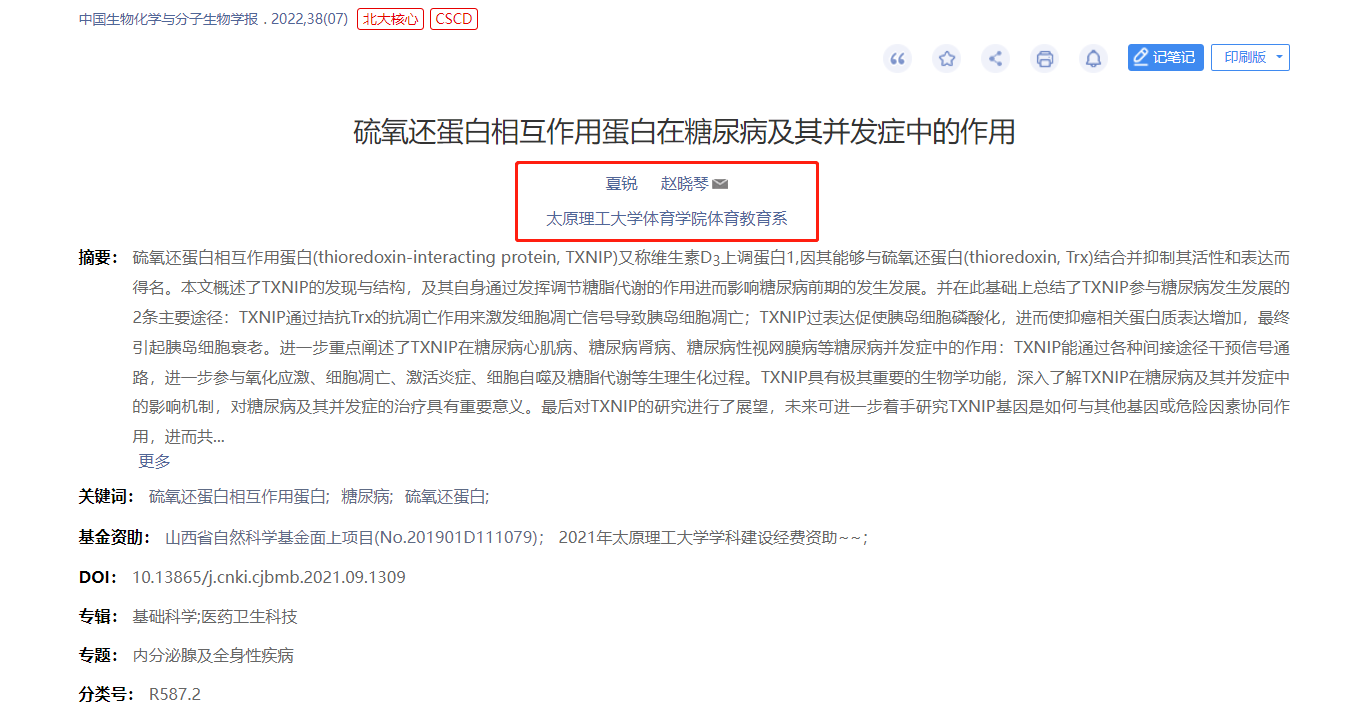 公司教师赵晓琴副教授指导硕士研究生夏锐的研究成果《硫氧还蛋白相互作用蛋白在糖尿病及其并发症中的作用》在《中国生物化学与分子生物学报》(2022年第7期发表)。《中国生物化学与分子生物学报》创刊于1985年,是中国科学技术协会主管,中国生物化学与分子生物学会和北京大学共同主办的高科技学术期刊,常年入编北京大学《中文核心期刊要目总览》来源期刊,入选CSCD 中国科学引文数据库来源期刊(2021-2022年度)(扩展版)。该论文是公司硕士研究生夏锐在赵晓琴副教授的指导下完成的科研成果,emc易倍为第一署名单位。