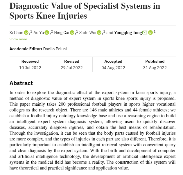 公司教师佟永清副教授、陈曦副教授的研究成果《Diagnostic Value of Specialist Systems in Sports Knee Injuries》在《Scanning》(2022年8月)发表。该刊已被国际权威数据库SCIE、SCI收录,该刊致力于发表经过严格同行评审的高质量原创文章,反映工程技术与跨学科融合领域的新进展、新技术、新成果,促进学科交叉与融合领域科研交流和科研成果转化。该论文是佟永清副教授(通讯作者)、陈曦副教授(第一作者)与韩国又石大学Hyunchoul CHO教授团队合作的成果,emc易倍为第一署名单位。