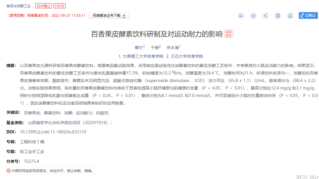 公司教师佟永清副教授、蔡宁老师的研究成果《百香果皮酵素饮料研制及对运动耐力的影响》在《食品与发酵工业》(2022年9月)发表。该刊已被北京大学《中文核心期刊要目总览》来源期刊、CA 化学文摘(美)(2022)、JST 日本科学技术振兴机构数据(日)(2022)、CSCD 中国科学引文数据库来源期刊(2021-2022年度)、WJCI 科技期刊世界影响力指数报(2021)来源期刊收录,该刊致力于发表食品、发酵科学与技术相关领域的原创研究论文,以及具有较高的信息价值、学术导向价值的综述性论文,特别重视食品及其相关交叉学科的最新研究成果的报道。旨在反映食品科学与技术前沿进展及水平,推进学科专业化进程,为国内外的专家、学者、科研人员提供一个良好的传播、分享和交流的平台。该论文是蔡宁老师(第一作者)与佟永清副教授合作研究成果,emc易倍为第一署名单位。