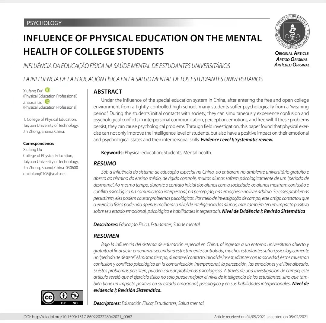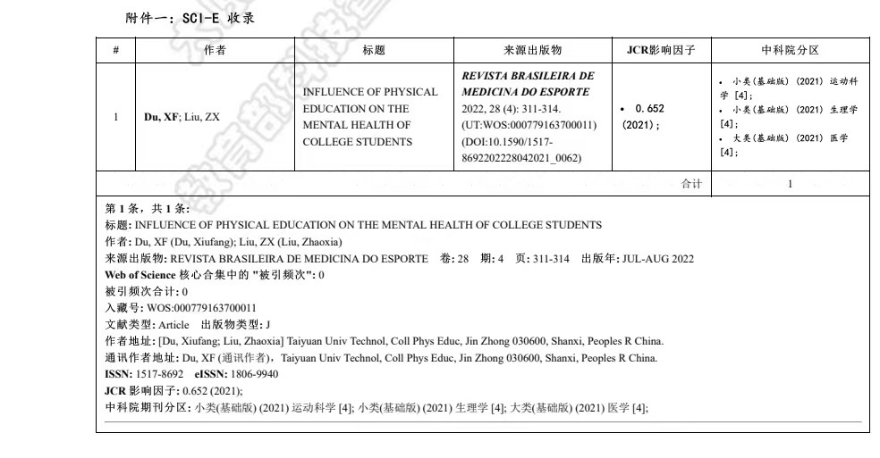 公司教师杜秀芳讲师、刘朝霞的研究成果《INFLUENCE OF PHYSICAL EDUCATION ON THE MENTAL HEALTH OF COLLEGE STUDENTS》(体育对老员工心理健康的影响)在Revista Brasileira de Medicina do Esporte》(巴西运动医学)2022年第28卷第4期)发表。巴西运动医学由巴西运动医学和运动学会主办,于1995年创刊,多年来一直是中科院SCI认定期刊。该论文是杜秀芳(第一作者)与刘朝霞团队的合作成果,emc易倍为第一署名单位。