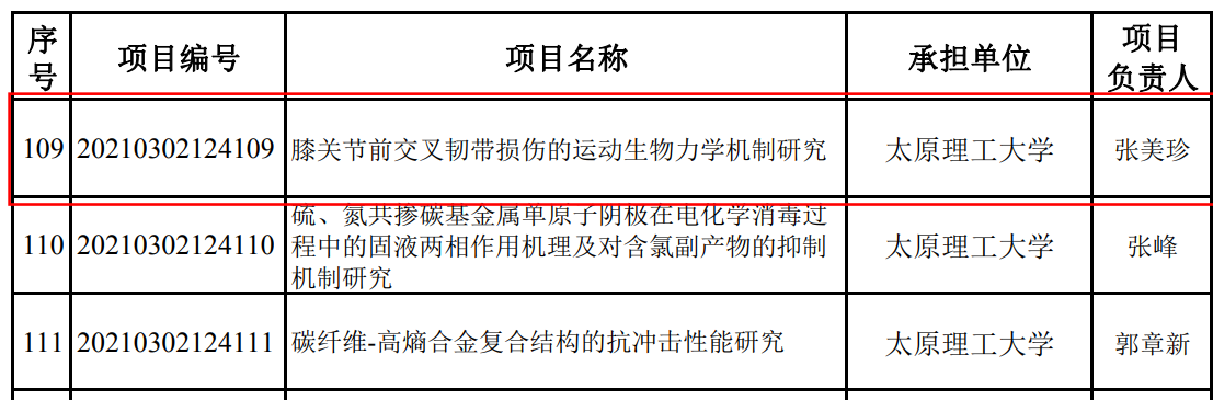2022年1月21日,山西省科学技术厅发布了“2021年度第二批山西省基础研究计划(自由探索类)拟资助项目公示”,立项公示显示,本次共立项938项。公司张美珍教授申报的项目“膝关节前交叉韧带损伤的运动生物力学机制研究”榜上有名,获批自然科学研究面上项目,该项目科研进账经费8万元。