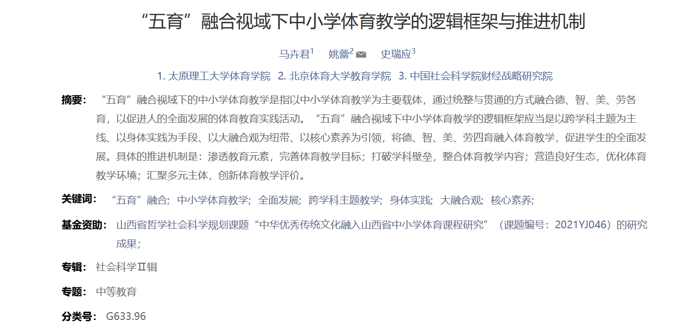 公司教师马卉君博士的研究成果《“五育”融合视域下中小学体育教学的逻辑框架与推进机制》在《教育理论与实践》(2022年11月)发表。《教育理论与实践》是山西教育科学研究院、山西省教育学会主办的综合性教育学术期刊,入编《中文核心期刊要目总览》(2020年版),被评定为“中国人文社会科学期刊AMI综合评价”A刊核心期刊。该论文是马卉君博士(第一作者)、北京体育大学姚蕾教授(通讯作者)、中国社会科公司史瑞应助理研究员的合作成果,emc易倍为第一署名单位。