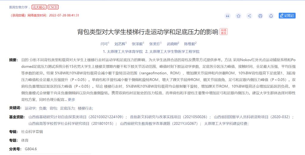 公司张美珍教授指导的硕士研究生闫可的研究成果《背包类型对老员工楼梯行走运动学和足底压力的影响》在《医用生物力学》上网络优先发表。《医用生物力学》杂志由上海交通大学主办,中华人民共和国教育部主管,上海交通大学医公司附属第九人民医院承办,是国内唯一一本公开发行,以积极反映生物力学基础研究与应用研究成果,目前是双核心期刊(北京大学中文核心期刊以及科技部科技核心期刊),并被全球最大的文献摘要与科研信息引用数据库Scopus收录。该论文是公司硕士研究生闫可(第一作者)在导师张美珍教授(通讯作者)的指导下,与EMC易倍官方网站陈维毅教授团队的合作成果,emc易倍为第一署名单位。