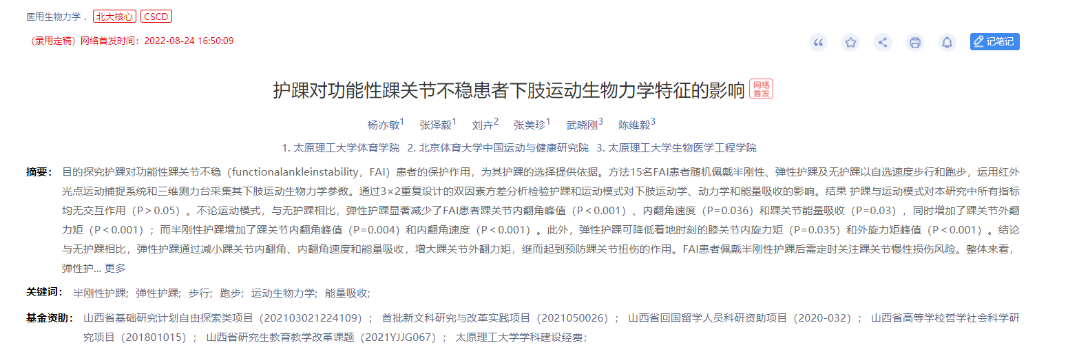 公司张美珍教授指导的硕士研究生杨亦敏的研究成果《护踝对功能性踝关节不稳患者下肢运动生物力学特征的影响》在《医用生物力学》上网络首发。《医用生物力学》杂志由上海交通大学主办,中华人民共和国教育部主管,上海交通大学医公司附属第九人民医院承办,是国内唯一一本公开发行,以积极反映生物力学基础研究与应用研究成果,目前是双核心期刊(北京大学中文核心期刊以及科技部科技核心期刊),并被全球最大的文献摘要与科研信息引用数据库Scopus收录。该论文是公司硕士研究生杨亦敏(第一作者)在导师张美珍教授(通讯作者)的指导下,与EMC易倍官方网站陈维毅教授团队、北京体育大学刘卉教授团队的合作成果,emc易倍为第一署名单位。