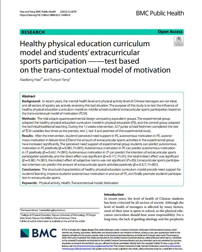 公司教师郝晓亮博士的研究成果《Healthy physical education curriculum model and students’ extracurricular sports participation ——test based on the trans-contextual model of motivation》在《BMC Public Health》发表。《BMC Public Health》,Top期刊,SCIE 2区,中科院2区,JCR影响因子:4.135。该论文是郝晓亮博士(第一作者)与杨云云(第二作者)的合作成果,emc易倍为第一署名单位。