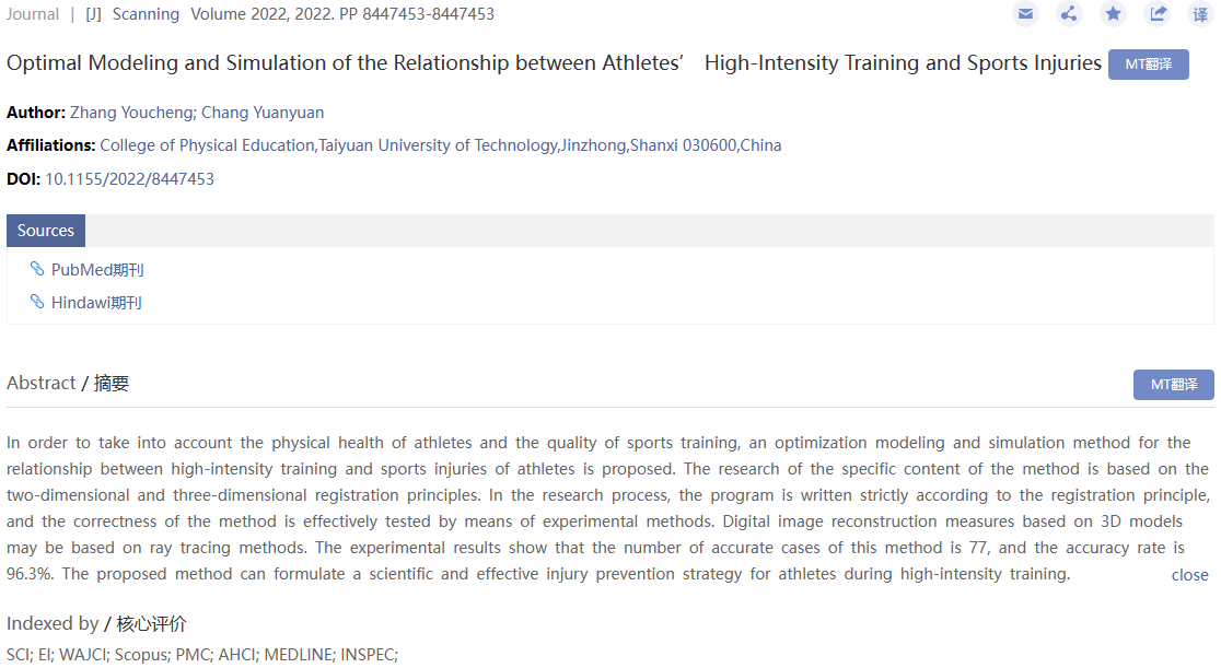 公司常媛媛副教授指导的硕士研究生张有成的研究成果《Optimal Modeling and Simulation of the Relationship between Athletes’ High-Intensity Training and Sports Injuries》在《Scanning》上发表。《Scanning》杂志为SCI四区期刊,JCR影响因子1.75(2021),期刊在SCI工程技术、显微镜技术和仪器仪表三类学科中具有较高的学术水平。该论文是公司硕士研究生张有成(第一作者)在导师常媛媛副教授(通讯作者)的指导下完成的,emc易倍为第一署名单位。
