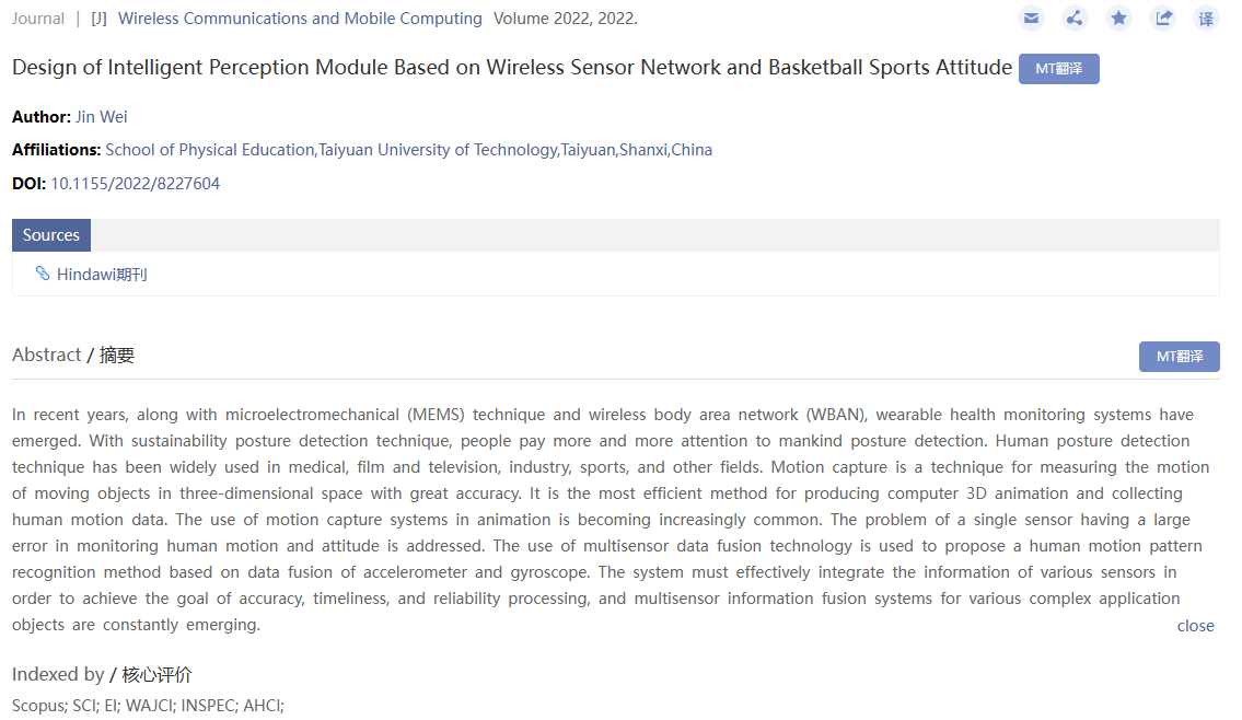 公司晋慰老师的研究成果《Optimal Modeling and Simulation of the Relationship between Athletes’ High-Intensity Training and Sports Injuries》在《Wireless Communications and Mobile Computing》上发表。《Wireless Communications and Mobile Computing》杂志为SCI四区期刊,期刊在SCI计算机科学及信息系统、电信学及电子与电气三类学科中具有较高的学术水平。该论文作者是晋慰老师,emc易倍为第一署名单位。