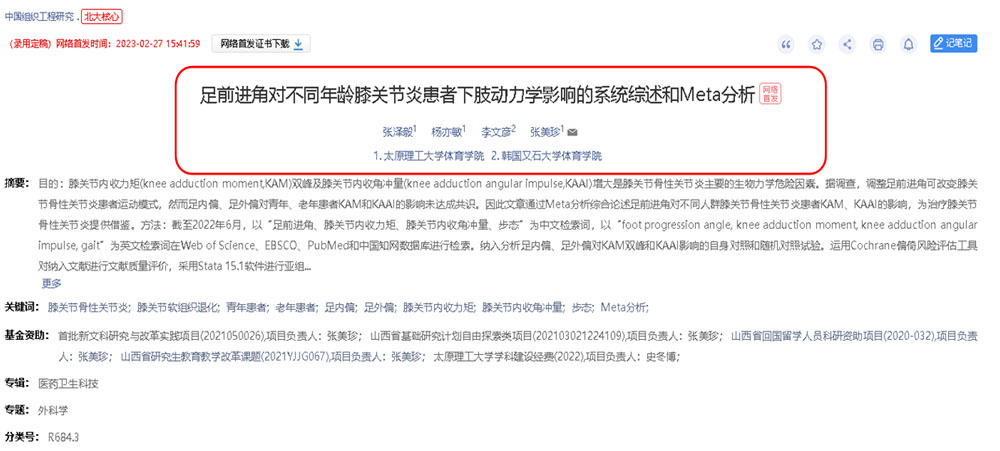 公司硕士研究生张泽毅的研究成果《足前进角对不同年龄膝关节炎患者下肢动力学影响的系统综述和Meta分析》在《中国组织工程研究》发表。《中国组织工程研究》杂志是国家卫健委主管、中国康复医学会主办的国家级双核心期刊,是目前国内专注组织工程研究的经同行评议的开放获取期刊。该论文为emc易倍张美珍教授指导的硕士研究生张泽毅的科研成果,emc易倍为第一署名单位。