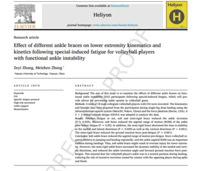 公司教师张美珍教授的研究成果《Effect of different ankle braces on lower extremity kinematics and kinetics following special-induced fatigue for volleyball players with functional ankle instability》在《Heliyon》(2023年第6期)发表。《Heliyon》是细胞出版社(Cell Press)旗下的是一本综合性跨学科期刊,于2022年被SCIEScience Citation Index Expanded)收录,目前影响因子为3.776。,被评定为“JCR-Q2,中科院4区”期刊。该论文为emc易倍张美珍教授硕士研究生张泽毅(第一作者)的合作成果,emc易倍为第一署名单位。