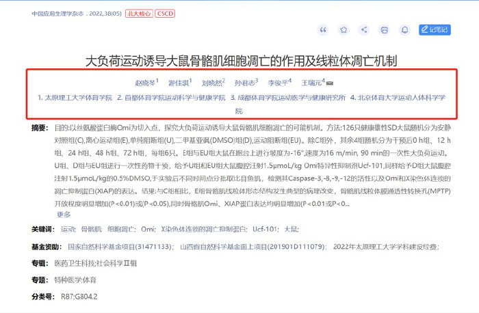 公司教师赵晓琴副教授的研究成果《大负荷运动诱导大鼠骨骼肌细胞凋亡的作用及线粒体凋亡机制》在《中国应用生理学杂志》(2022年第5期)发表。《中国应用生理学杂志》是中国生理学会、军事医学科公司和卫生学环境医学研究所主办的学术期刊,于1985年经新闻总署批准的正规刊物,被评定为“中国科技核心期刊、CSCD中国科学引文数据库来源期刊、北京大学《中文核心期刊要目总览》来源期刊,同时被国内外多个科技期刊检索系统或数据库收录。该论文是赵晓琴副教授(第一作者)与北京体育大学王瑞元教授的合作成果,emc易倍为第一署名单位。
