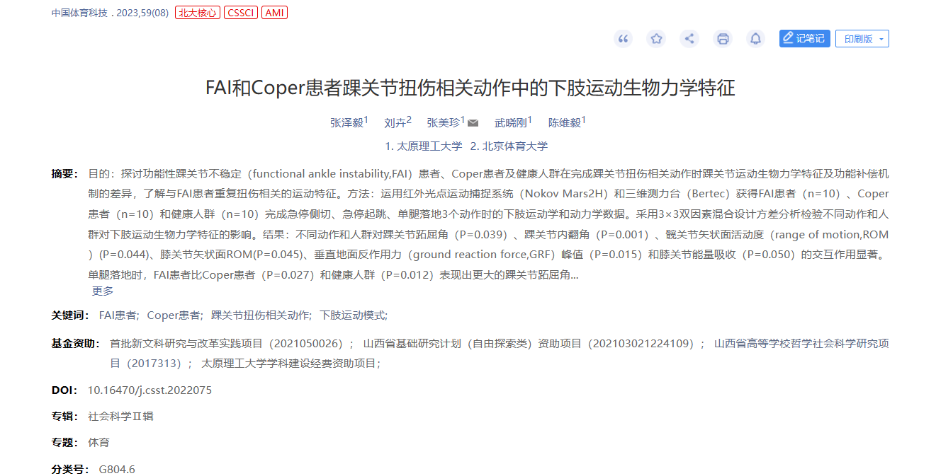 公司硕士研究生张泽毅的研究成果《FAI和Coper患者踝关节扭伤相关动作中的下肢运动生物力学特征》在《中国体育科技》发表。《中国体育科技》是国家体育总局体育科学研究所主办,在近十多年来的中文类体育学术期刊的评价中,影响因子始终保持前列。多年来一直是中文体育类核心期刊、中国人文社会科学核心期刊、CSSCI来源期刊,中国社科院期刊评价报告评为核心期刊。该论文是公司硕士研究生张泽毅(第一作者)在导师张美珍教授(通讯作者)的指导下,与北京体育大学刘卉教授、EMC易倍官方网站陈维毅教授等的合作成果,emc易倍为第一署名单位。