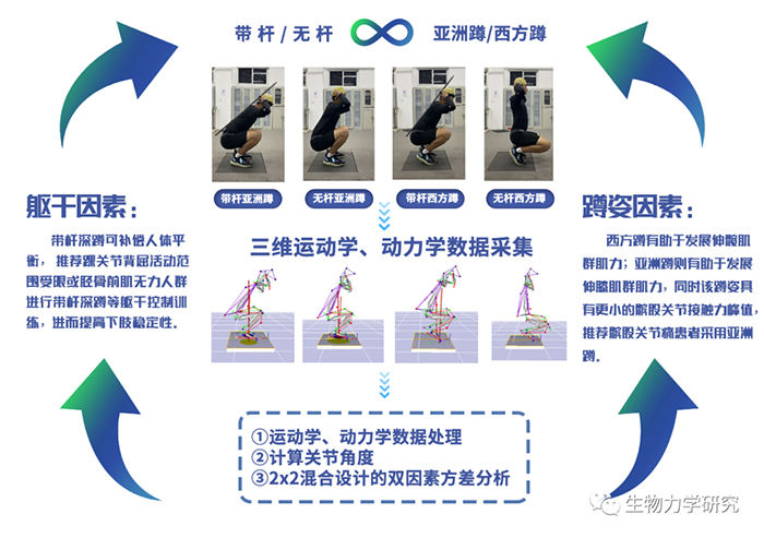 该论文探讨探究躯干约束对青年群体亚洲蹲和西方蹲时下肢运动生物力学特征的影响,为深蹲训练的应用和推广提供实证性依据。研究发现,西方蹲有助于训练伸髋肌群肌力,亚洲蹲则有助于训练伸膝肌群肌力。西方蹲髌股关节接触力峰值显著大于亚洲蹲,故推荐髌股关节痛患者采用亚洲蹲。带杆深蹲可补偿人体平衡,建议由于踝关节背屈活动范围受限或胫骨前肌无力人群可以考虑进行带杆深蹲等躯干控制训练,有助于帮助提高深蹲时下肢稳定性。
