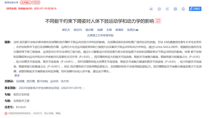 公司本科生郝乐天的研究成果《不同躯干约束下蹲姿对人体下肢运动学和动力学的影响》在《医用生物力学》(网络首发)发表。《医用生物力学》杂志由上海交通大学主办,中华人民共和国教育部主管,上海交通大学医公司附属第九人民医院承办,是国内唯一一本公开发行,以积极反映生物力学基础研究与应用研究成果,推动国内外学术交流,促进医、理、工各学科相互了解和合作为目的学术性刊物。目前,本刊是双核心期刊(北京大学中文核心期刊以及科技部科技核心期刊),并被全球最大的文献摘要与科研信息引用数据库Scopus收录。该论文是公司本科生郝乐天(第一作者)在导师张美珍教授(通讯作者)指导下的研究成果,emc易倍为第一署名单位。该成果依托国家级老员工创新创业项目:不同姿势控制对亚洲蹲和西方蹲下肢运动生物力学特征的影响。
