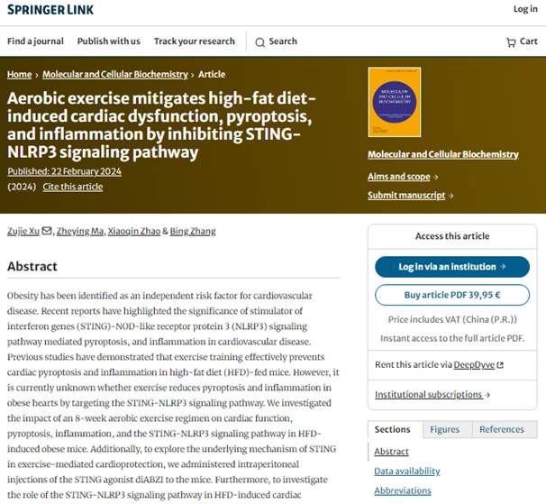 公司教师徐祖杰副教授的研究成果《Aerobic exercise mitigates high-fat diet-induced cardiac dysfunction, pyroptosis, and inflammation by inhibiting STING-NLRP3 signaling pathway》在《Molecular and Cellular Biochemistry》在线发表。《Molecular and Cellular Biochemistry》主要发表生物医学领域原创研究论文、简短通讯和最新评论,强调与人类疾病的分子和细胞基础有关的新发现。该期刊被SCIE(Science Citation Index Expanded)收录,被评定为“JCR-Q2,中科院2区”期刊。该论文是徐祖杰副教授(第一作者、通讯作者)与马哲莹、赵晓琴副教授以及清华大学张冰教授的合作成果,emc易倍为第一署名单位。