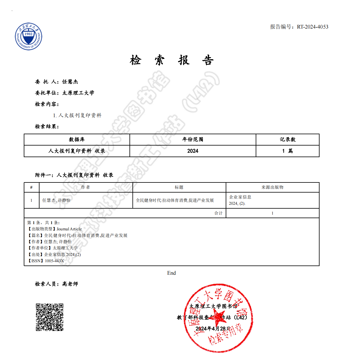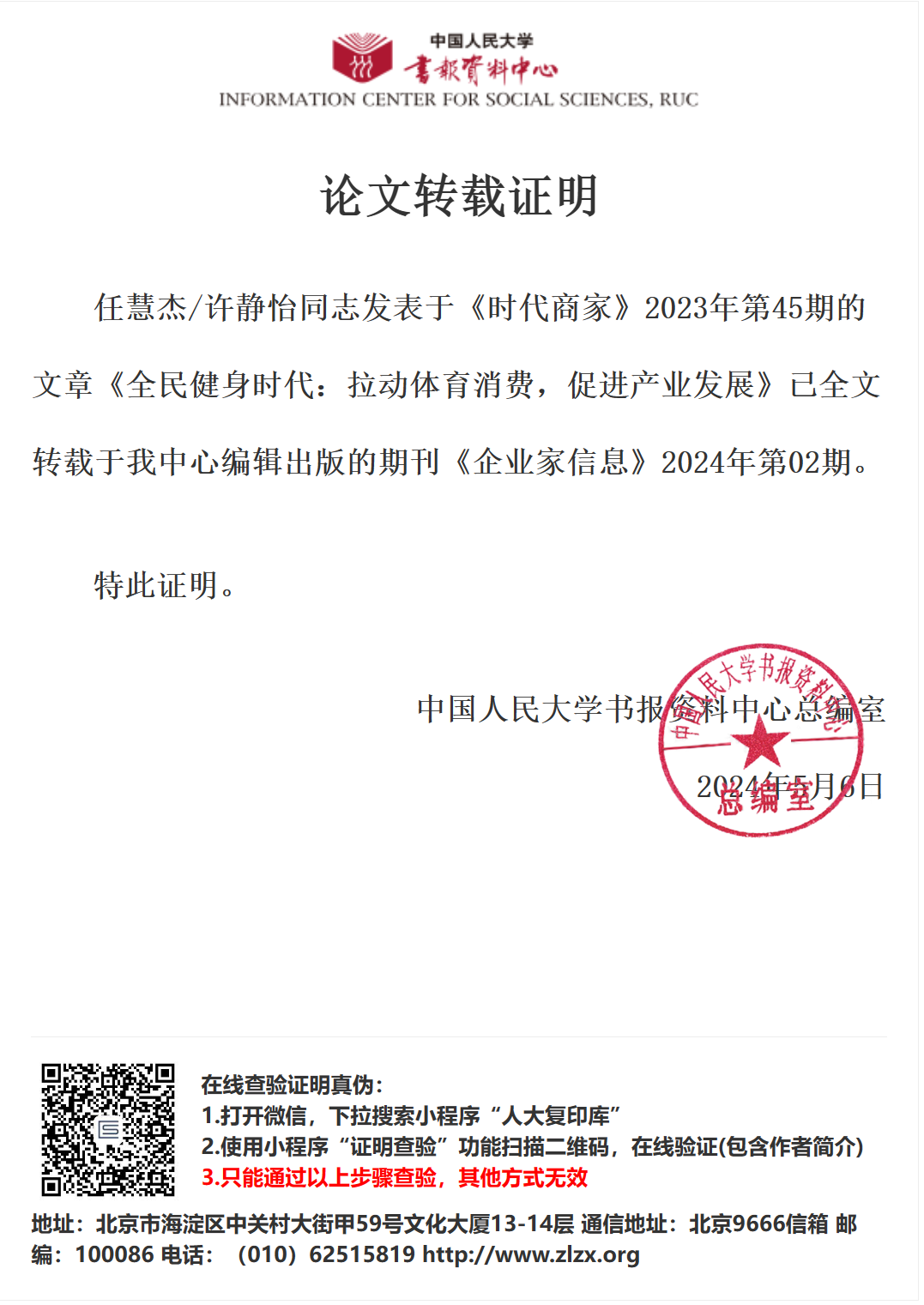 任慧杰博士团队于2023年在《时代商家》发表的论文《全民健身时代:拉动体育消费,促进产业发展》被中国人民大学复印报刊资料《企业家信息》2024年第2期全文转载,emc易倍为第一署名单位。