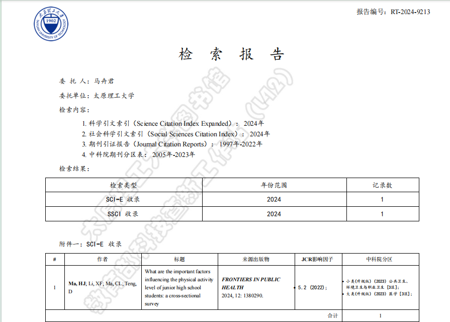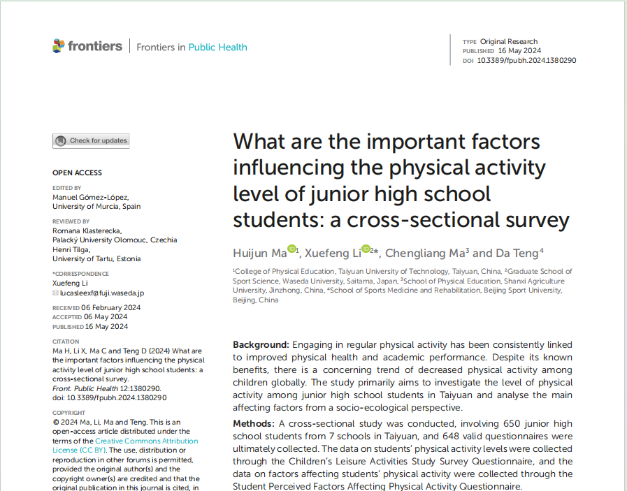 公司教师马卉君的研究成果《What are the important factors influencing the physical activity level of junior high school students: a cross-sectional survey》在《Frontiers in Public Health》发表。《Frontiers in Public Health》涵盖公共卫生方向的不同研究领域,旨在向全球研究人员、学者、临床医生、政策制定者和公众传播和交流科学知识和有影响力的发现的最前沿。该期刊同时被SCIE(Science Citation Index Expanded)和SSCI(Social Science Citation Index)双数据库收录,被评定为“JCR-Q2,中科院3区”期刊。该论文是马卉君博士(第一作者)、日本早稻田大学李雪峰博士(通讯作者)、山西农业大学马成亮教授、北京体育大学滕达的合作成果,emc易倍为第一署名单位。