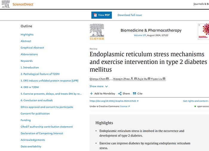 公司教师赵晓琴副教授团队的研究成果《Endoplasmic reticulum stress mechanisms and exercise intervention in type 2 diabetes mellitus》在《Biomedicine & pharmacotherapy》在线发表。《Biomedicine & pharmacotherapy》主要发表生物医学领域原创研究论文、简短通讯和最新评论,强调特定主题的研究,例如分子机制、正常和病理细胞中的基因调控以及对致癌剂的敏感性。该期刊被SCIE(Science Citation Index Expanded)收录,被评定为“JCR-Q1,中科院2区top,影响因子6.9(2023年)”期刊。该论文是公司硕士研究生陈芊聿(第一作者)在导师赵晓琴副教授(通讯作者)指导下完成的研究成果,emc易倍为第一署名单位。