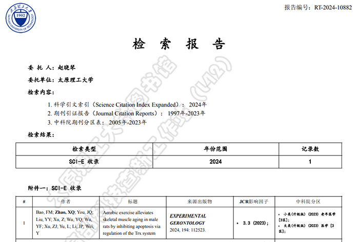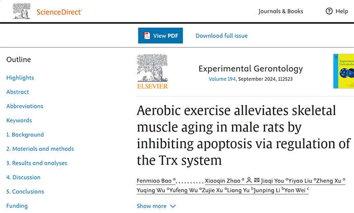 公司教师赵晓琴副教授的研究成果“Aerobic exercise alleviates skeletal muscle aging in male rats by inhibiting apoptosis via regulation of the Trx system”在《Experimental Gerontology》2024年第194卷发表。《Experimental Gerontology》涵盖生物老年学所有的研究领域,重点关注系统层面的研究,旨在弥合老年学基础和临床方面之间差距的研究。该期刊同时被SCIE(Science Citation Index Expanded)数据库收录,被评定为“JCR-Q2,中科院3区,影响因子3.3(2023年)期刊。该论文是公司硕士研究生鲍粉苗(第一作者)在导师赵晓琴副教授(通讯作者)指导下完成的研究成果,emc易倍为第一署名单位。